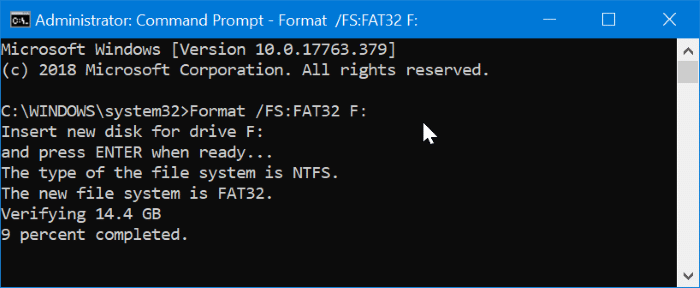 명령에서 “X”를 FAT32 파일 시스템으로 포맷할 USB 저장 장치의 실제 드라이브 문자로 바꿉니다. 앞서 언급했듯이 드라이브를 포맷하는 데 몇 시간이 걸릴 수 있습니다.