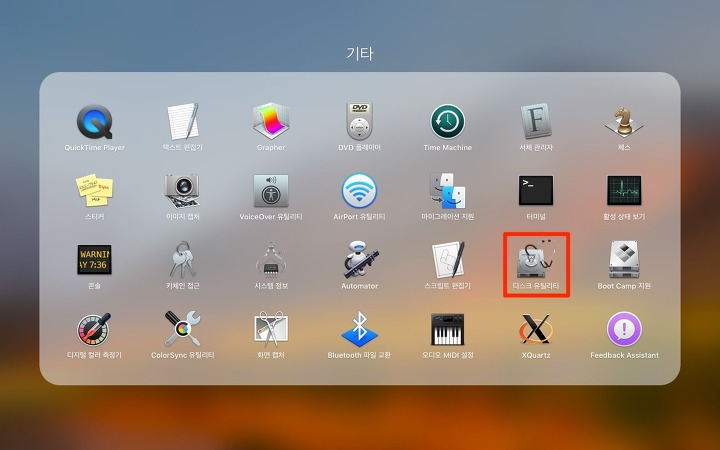 - 런치패드(Applications)에서 “기타” > “디스크 유틸리티”를 열거나, Finder 또는 Spotlight에서 “디스크 유틸리티”를 검색하여 엽니다.
