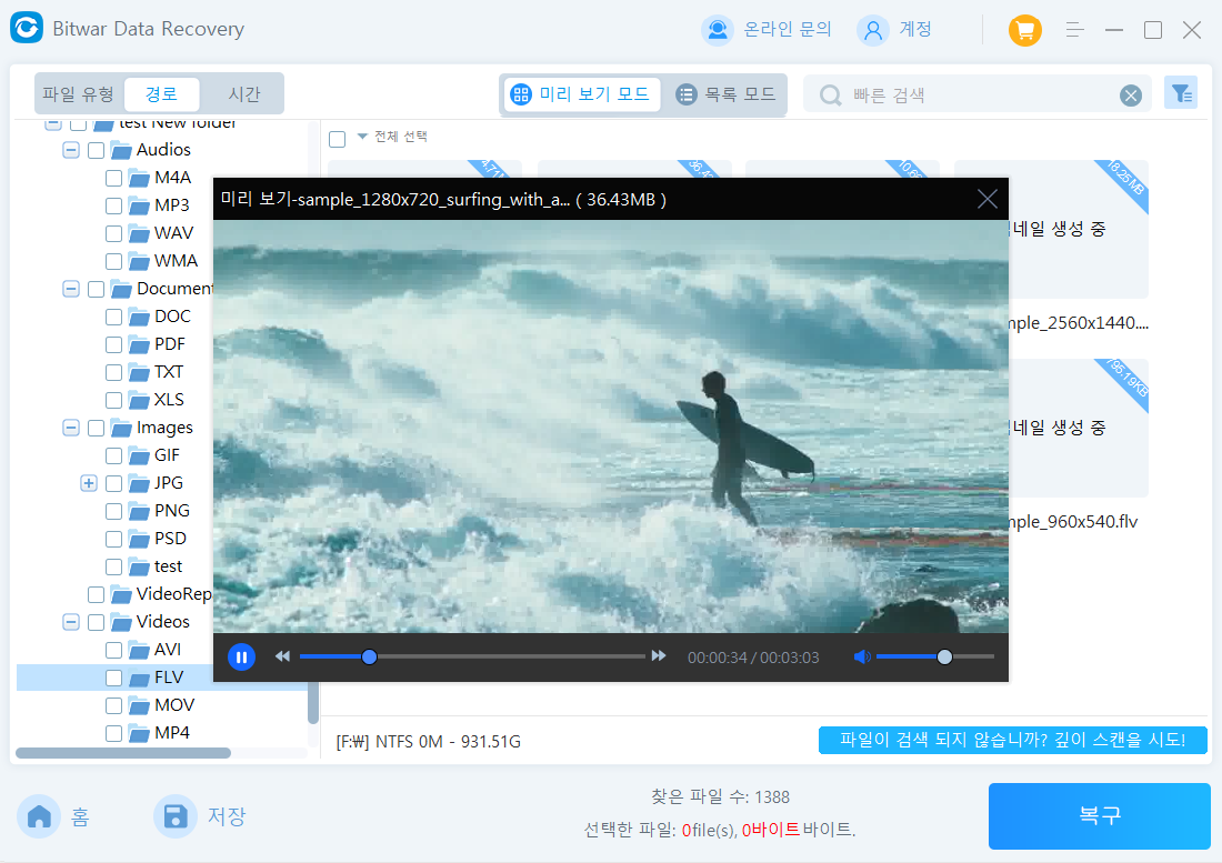 스캔 후 파일 이름, 유형 경로, 시간 등의 파일이 나열됩니다. 미리 보고 복원할 항목을 선택하고 "복구"를 누르십시오.